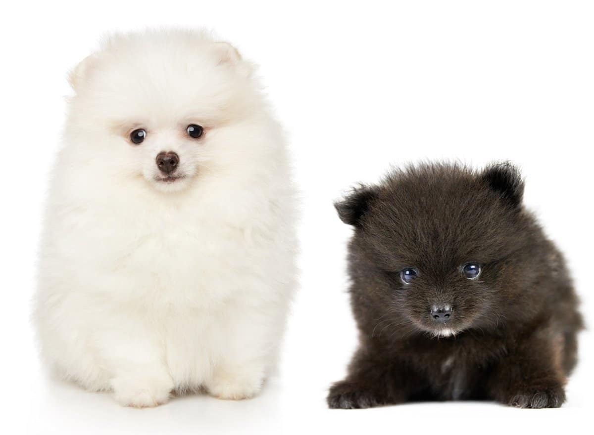 White Teddy Bear Pomeranian Puppy and Black Teddy Bear Pomeranian Puppy